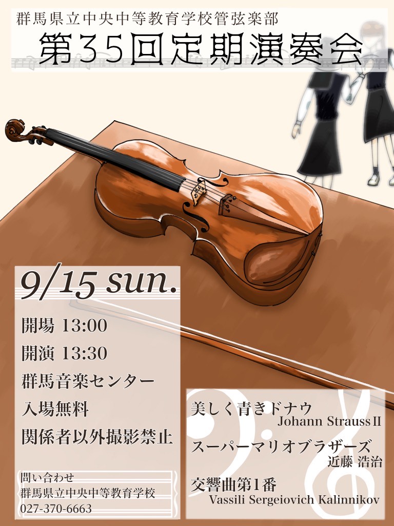 群馬音楽センターを会場に、37回目の定期演奏会が行われました。多くの皆様に御来場いただきました。ありがとうございました。今回演奏された曲は有名なものが多く、どなたにも楽しんでいただけたのではないでしょうか。次回第38回定期演奏会は、2026年3月29日(日)です。次回も皆様の御来場をお持ちしております。